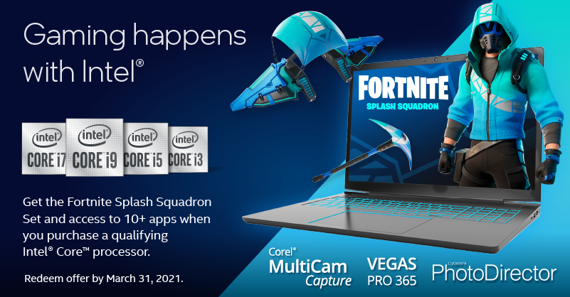 One can be eligible to redeem the 'splash squadron' bundle if they have a selective intel cpu. Get access to 10+ creativity and gaming software offers with purchase of a qualifying intel core processor. A great value for free. Players can get the fortnite splash squadron/damage set/bundle and access to 10+ apps when purchasing a qualifying intel core processor.